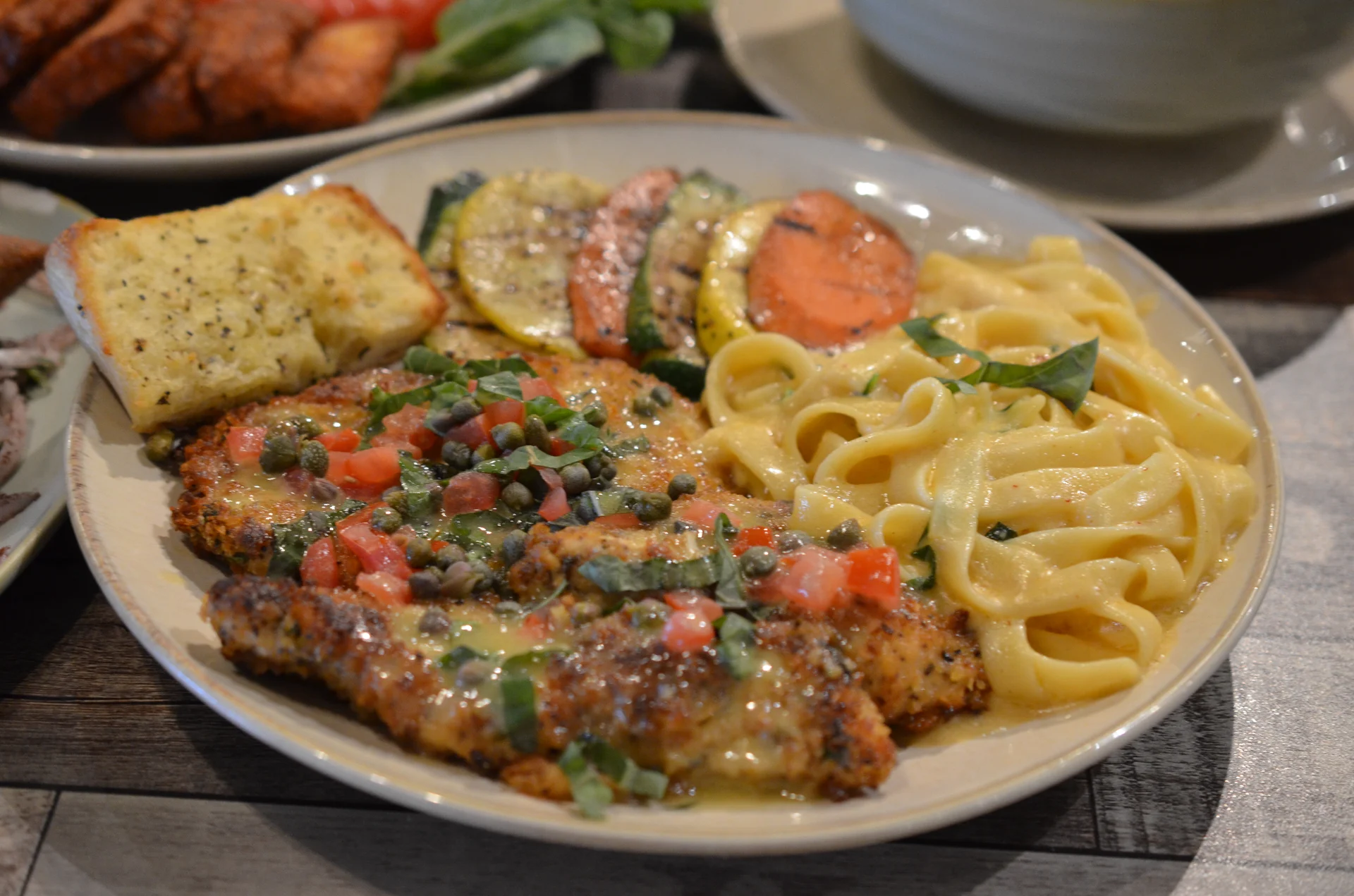 Lightly Breaded Chicken Breast, Topped With Lemon Butter Sauce, Capers, Tomatoes & Basil Served With Chipotle Alfredo & Grilled Vegetables