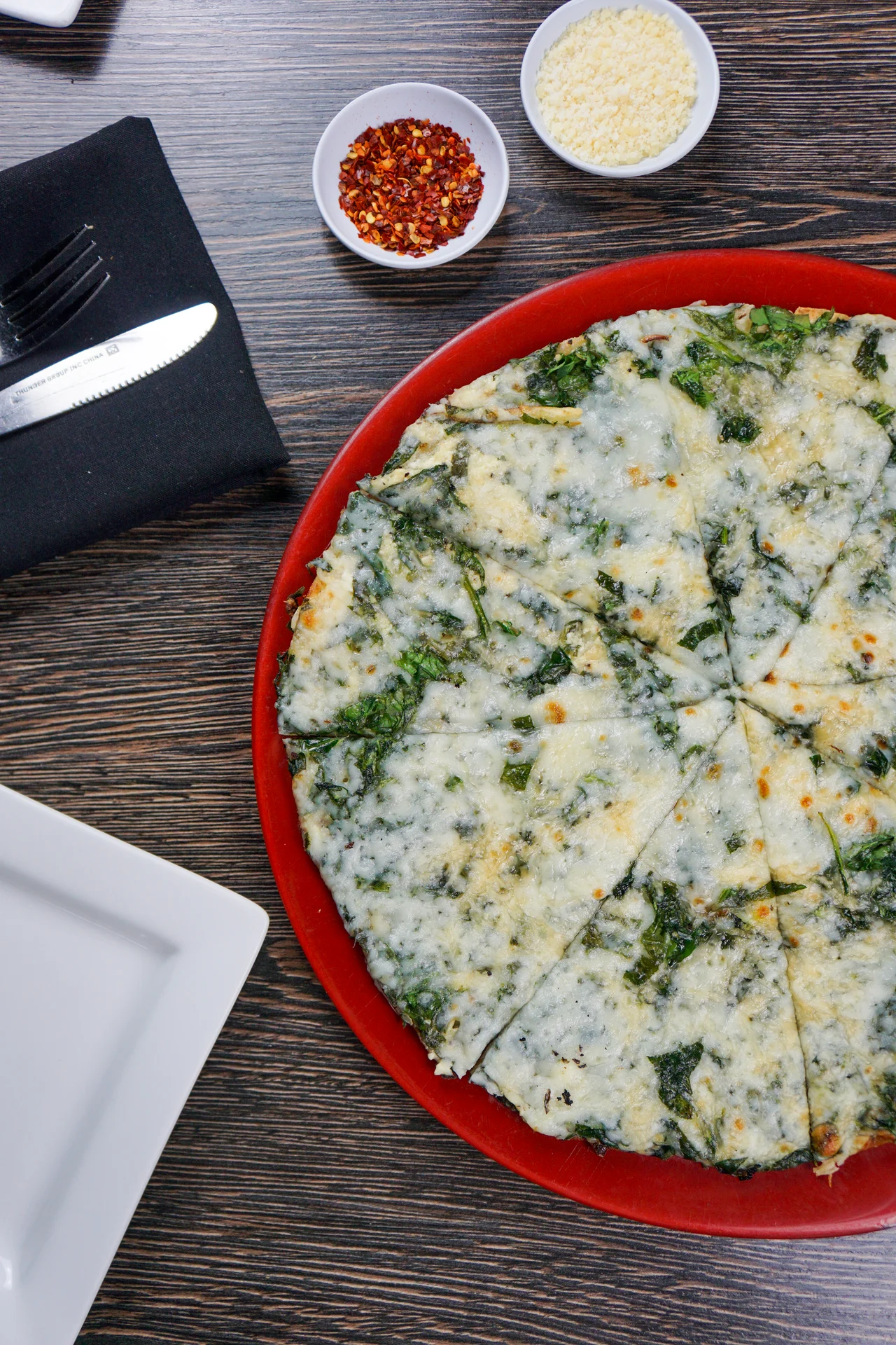 Thin & Crispy White Tortilla Crust, Creamy Alfredo Base, Baby Spinach, Crushed Garlic, Topped with Feta, Parmesan & Mozzarella Cheese.