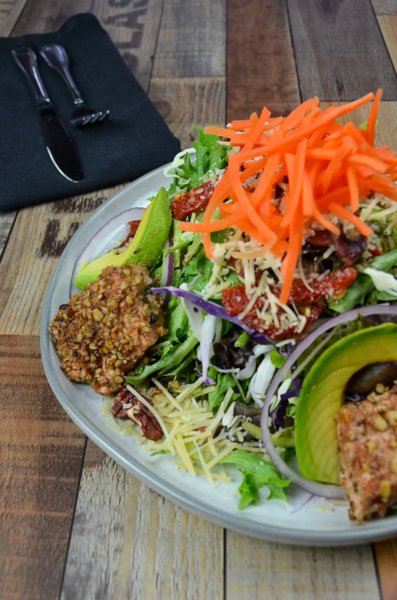Mixed Greens, Carrots, Avocado, Red Onion, Sun-Dried Tomatoes, Roasted Pecans & Parmesan Cheese Tossed In A Sun-Dried Tomato Ginger Vinaigrette