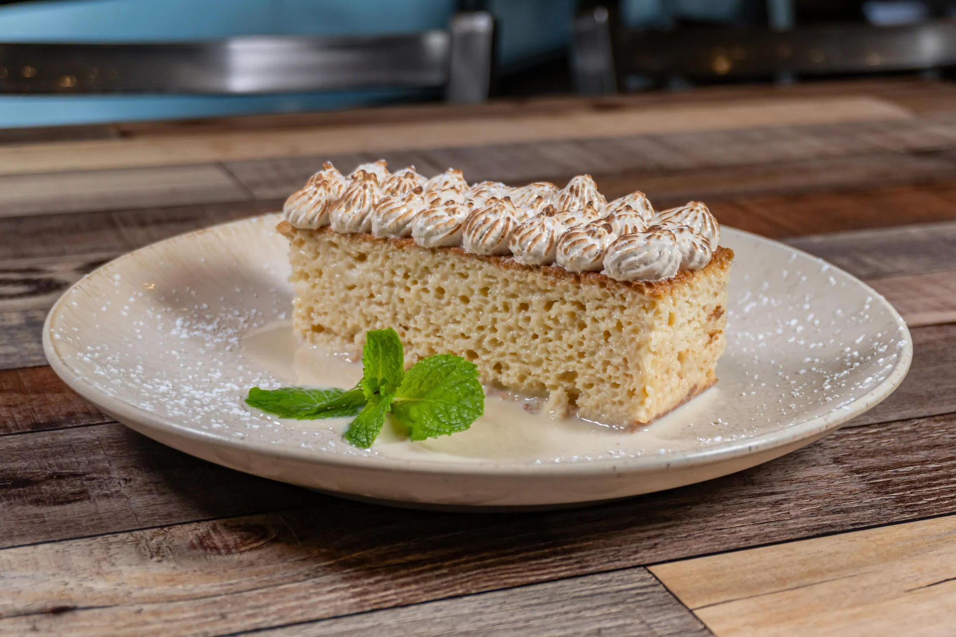 Sponge cake soaked in 3 milks topped with toasted brown sugar meringue