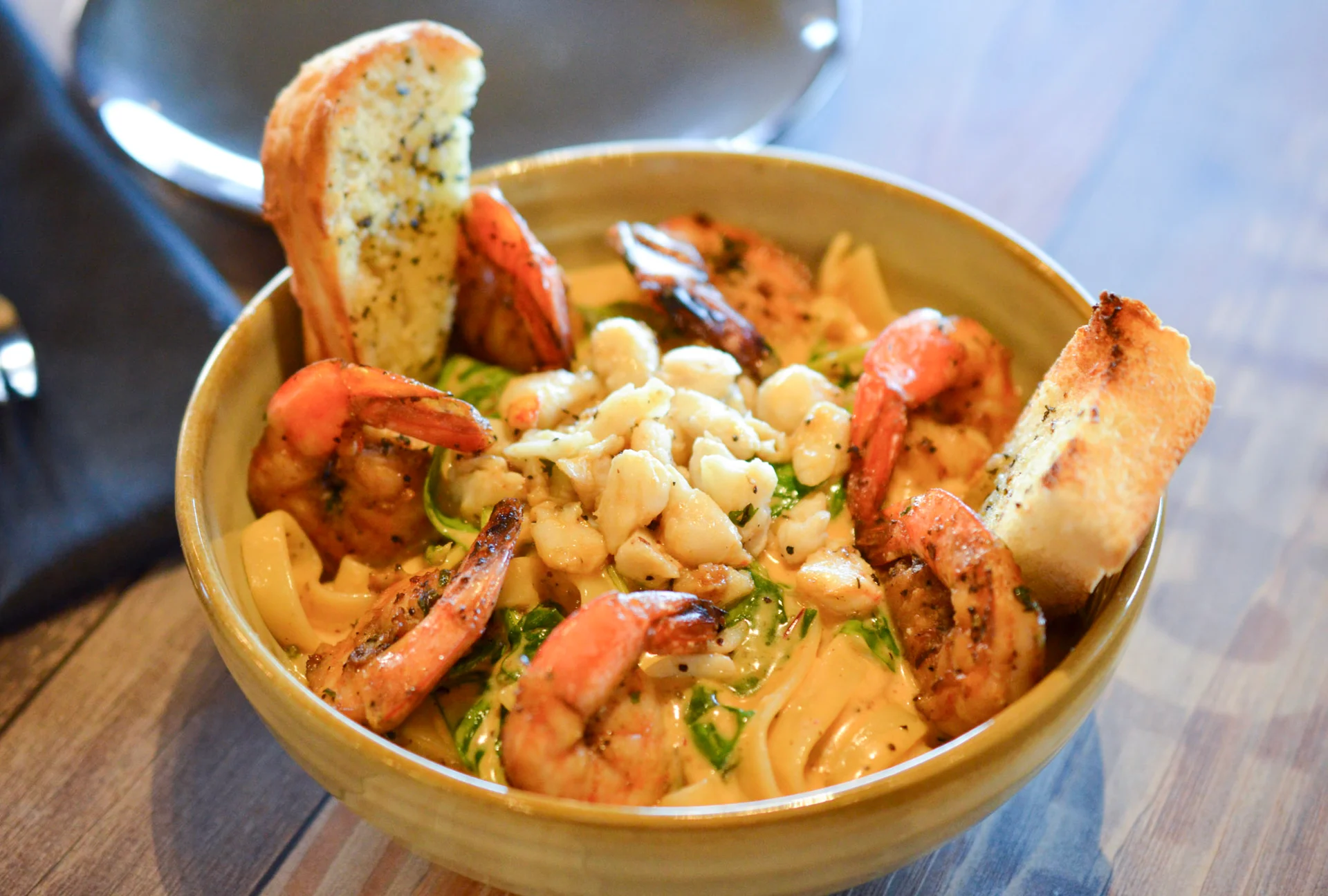 Fettuccini Pasta In Spicy Creamy Chipotle Black Pepper Sauce & Fresh Baby Spinach Topped With Grilled Shrimp & Crab Meat