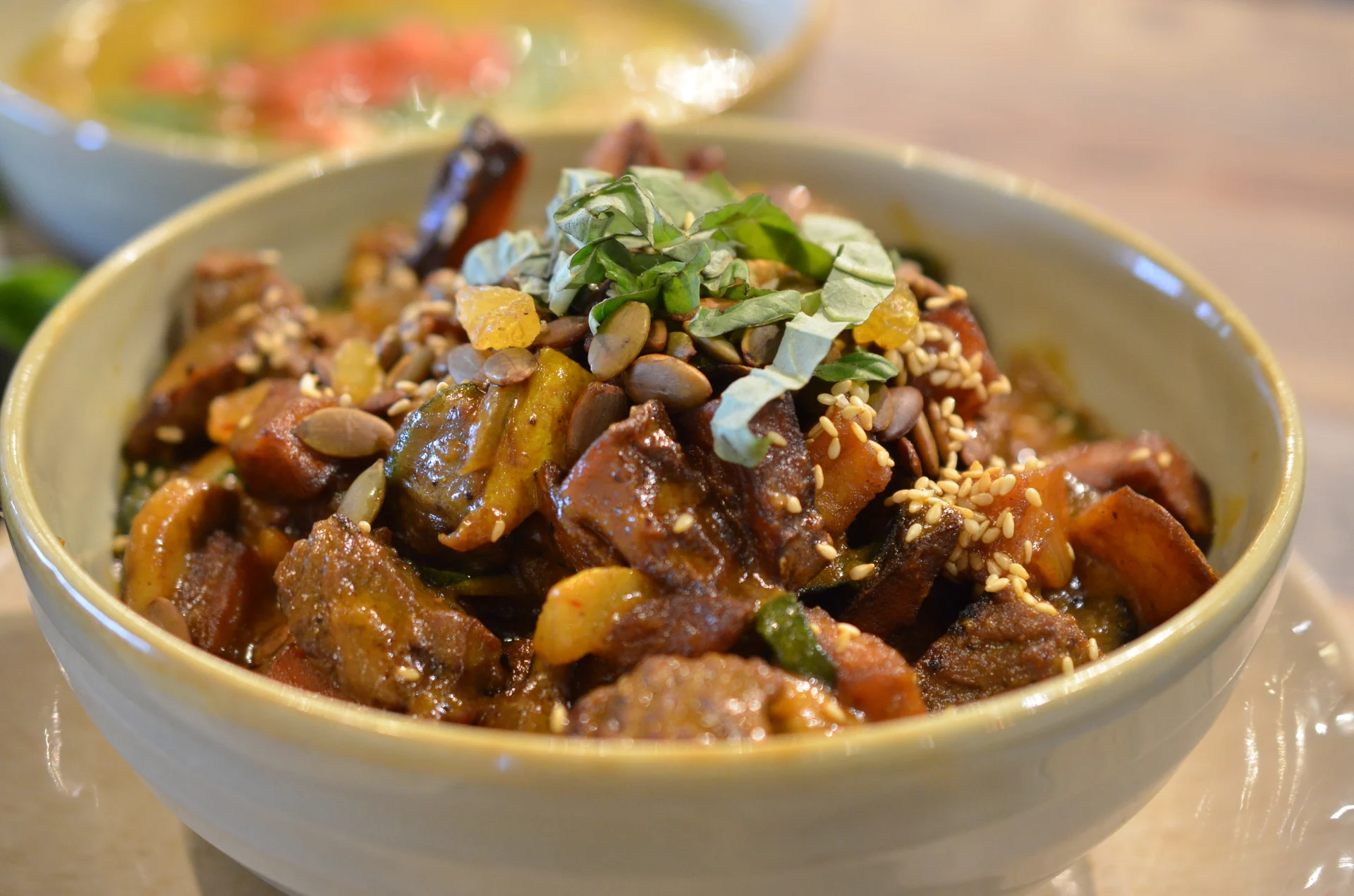 Grilled Beef Tenderloin, Portobello Mushroom, Squash, Zucchini, Potatoes & in a Sweet & Spicy Curry Sauce on a Bed of Basmati Saffron Rice / Topped with Roasted Yellow Raisins & Pumpkinseeds!