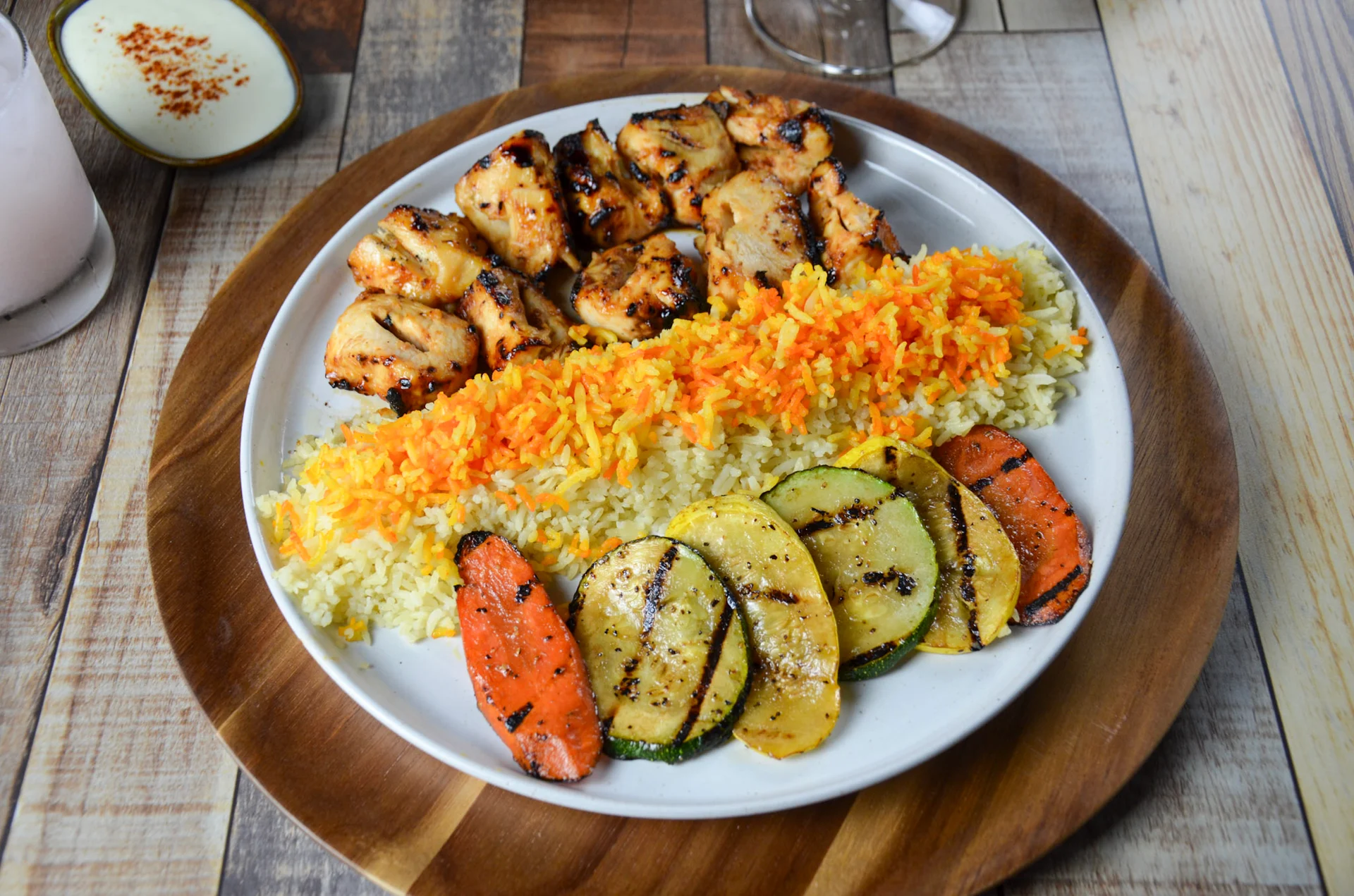 Two Skewers Of Marinated Chicken Medallions Served With Creamy Garlic Sauce, Saffron Basmati Rice & Grilled Vegetables
