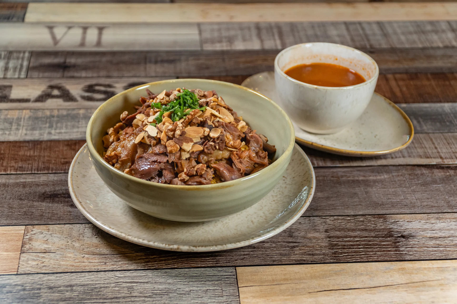 Stewed Lamb, Off The Bone, Served On Spiced Rice, Topped With Toasted Nuts And Currants, With A Tomato Based Broth On The Side