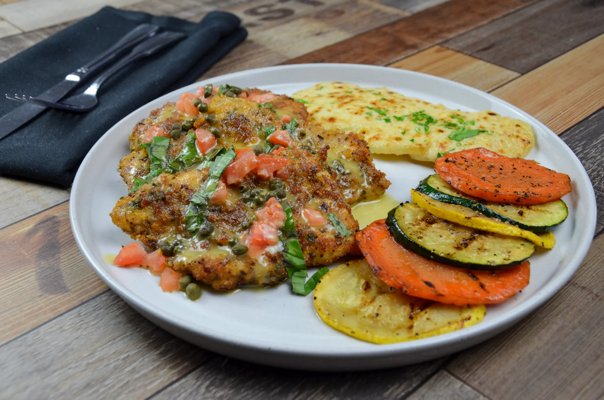 Lightly Breaded Chicken Breast, Topped With Lemon Butter Sauce, Capers, Tomatoes & Basil Served With Creamy Scalloped Potatoes & Grilled Vegetables