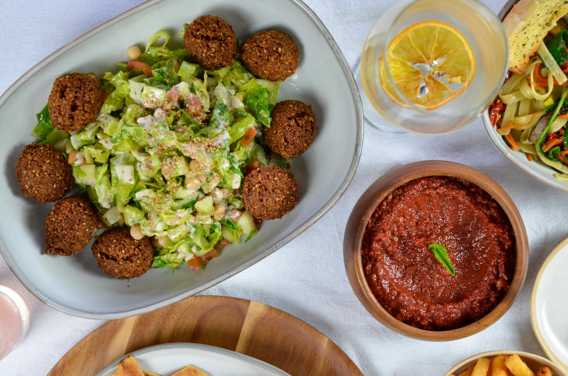 Romaine, Cucumber, Tomato, Parsley, Green & Red Onion, Fresh Mint & Chickpeas Tossed In Extra Virgin Olive Oil & Lemon Juice, Topped w / Crispy Falafel Balls, Tahini Sauce & Toasted Sesame Seeds