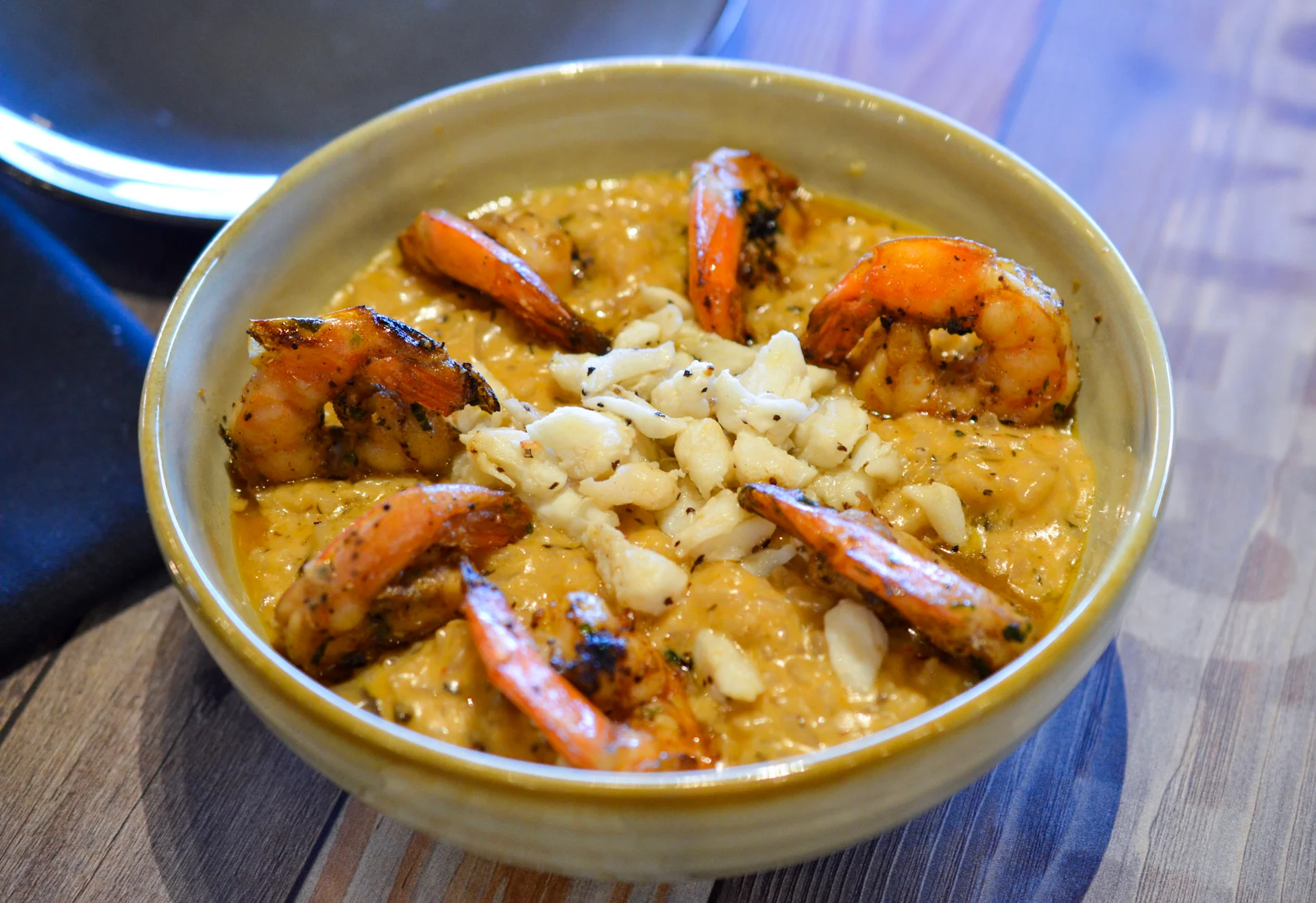 Mushroom Risotto In Spicy Creamy Chipotle Black Pepper Sauce Topped With Grilled Shrimp & Crab Meat