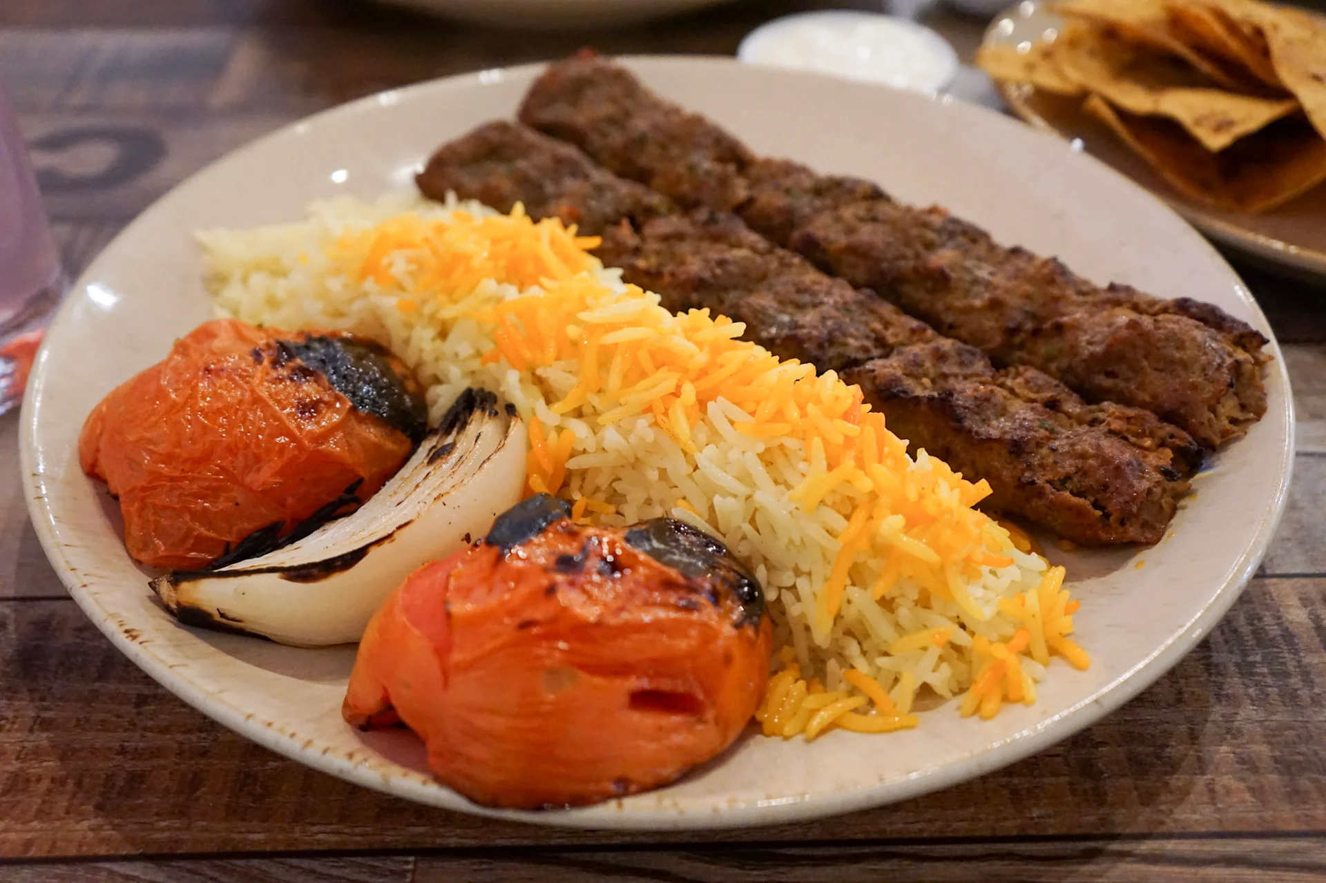 Two Skewers Of Seasoned Ground Beef Served w/ Sliced Onion, Sumac, Creamy Garlic Sauce, Saffron Basmati Rice & Grilled Tomato And Onion