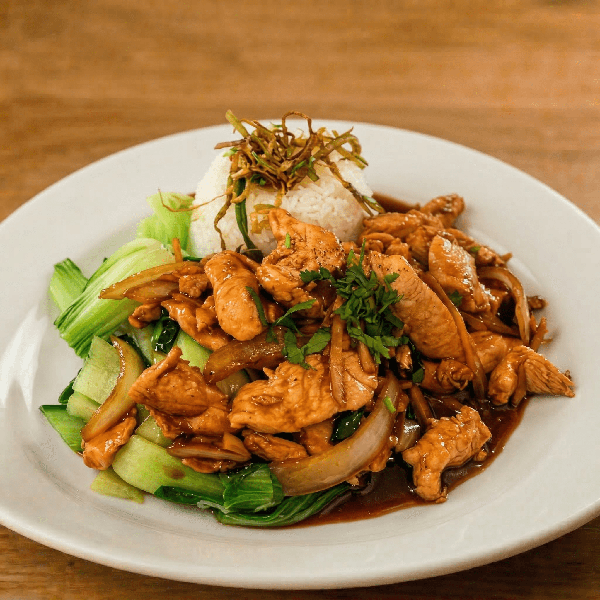 Lean chicken breast caramelized with minced ginger & nuoc mam. Served with steamed baby bokchoy