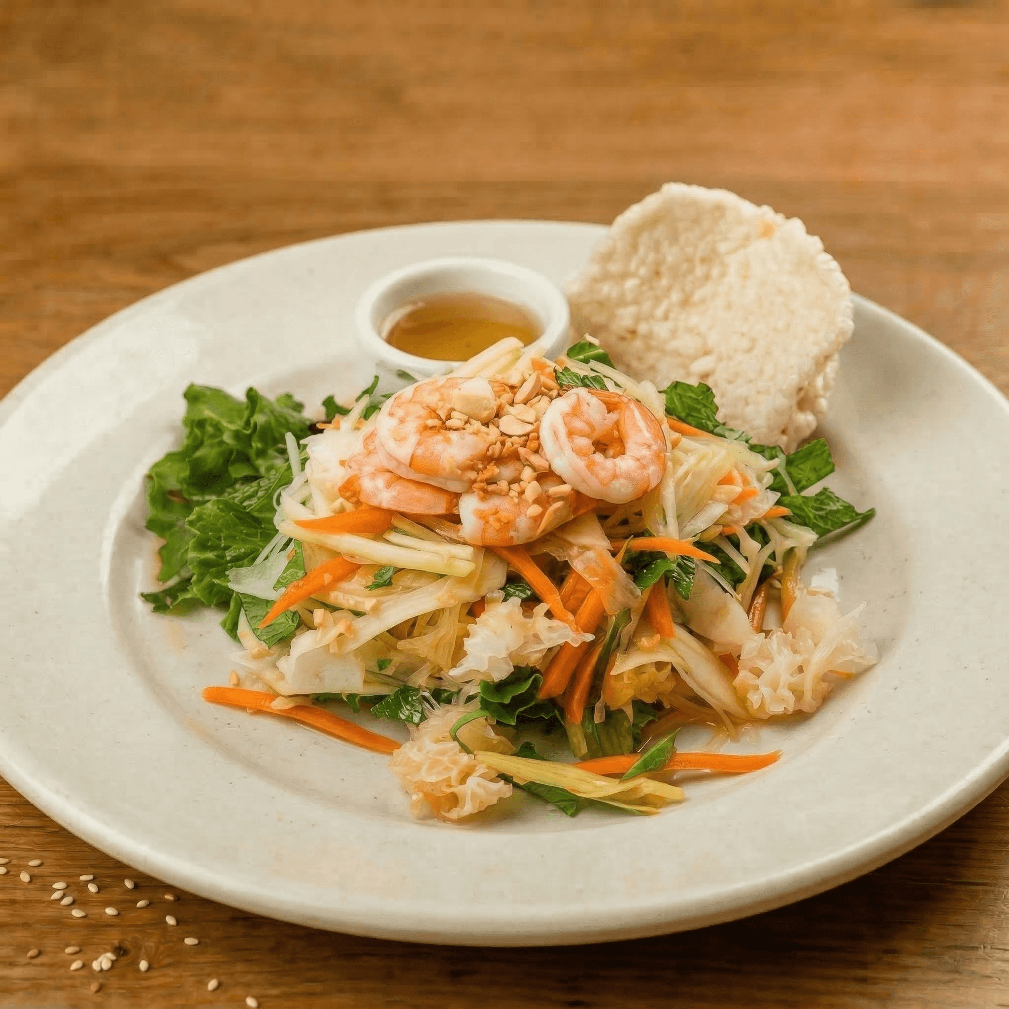 Assortment of shredded carrot, daikon root, onion, calamari, jellyfish, seaweed, shrimp, nori & sage. Served with nuoc mam and shrimp chips. All salads topped with crushed peanut