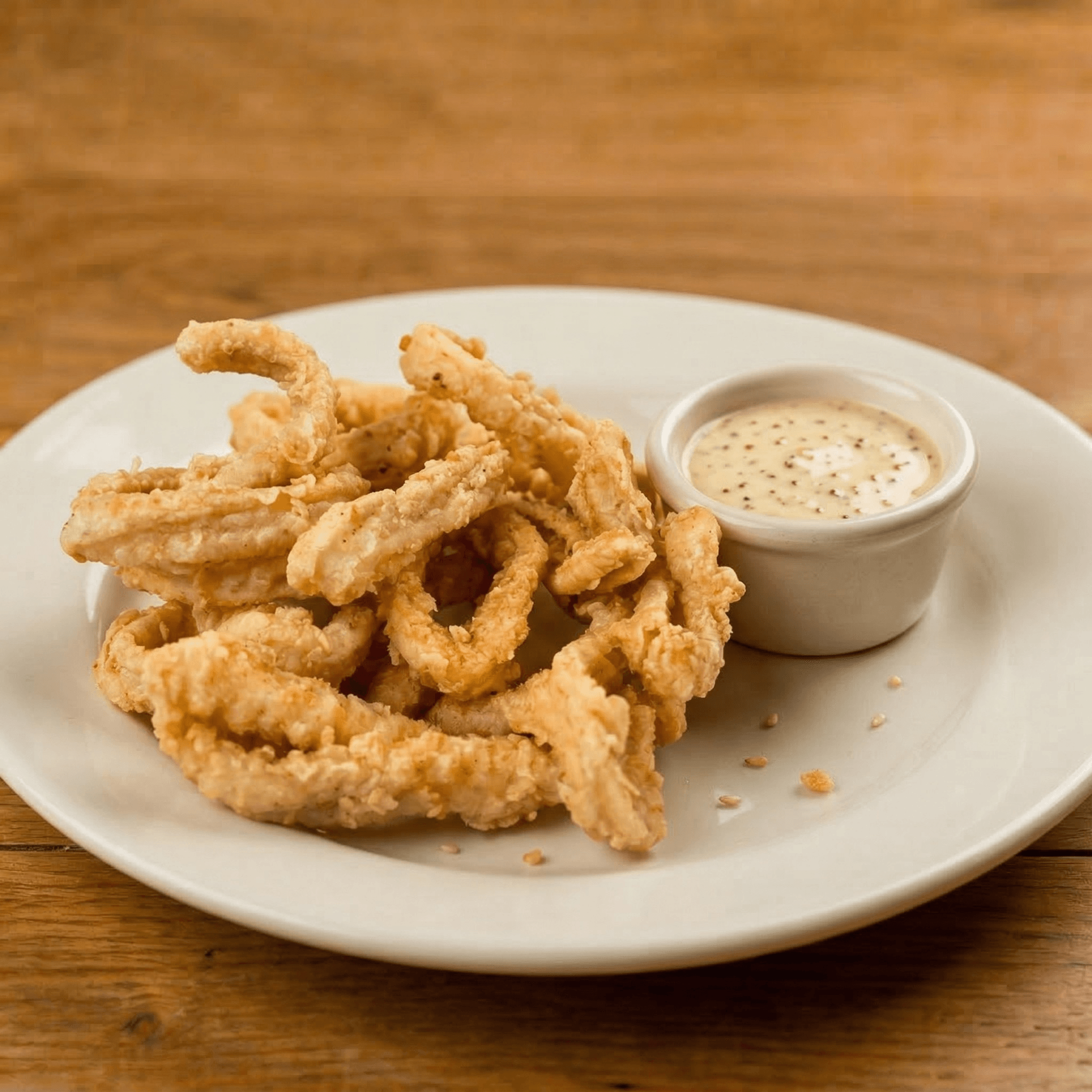 Golden fried calamari. Served with house garlic aioli dip