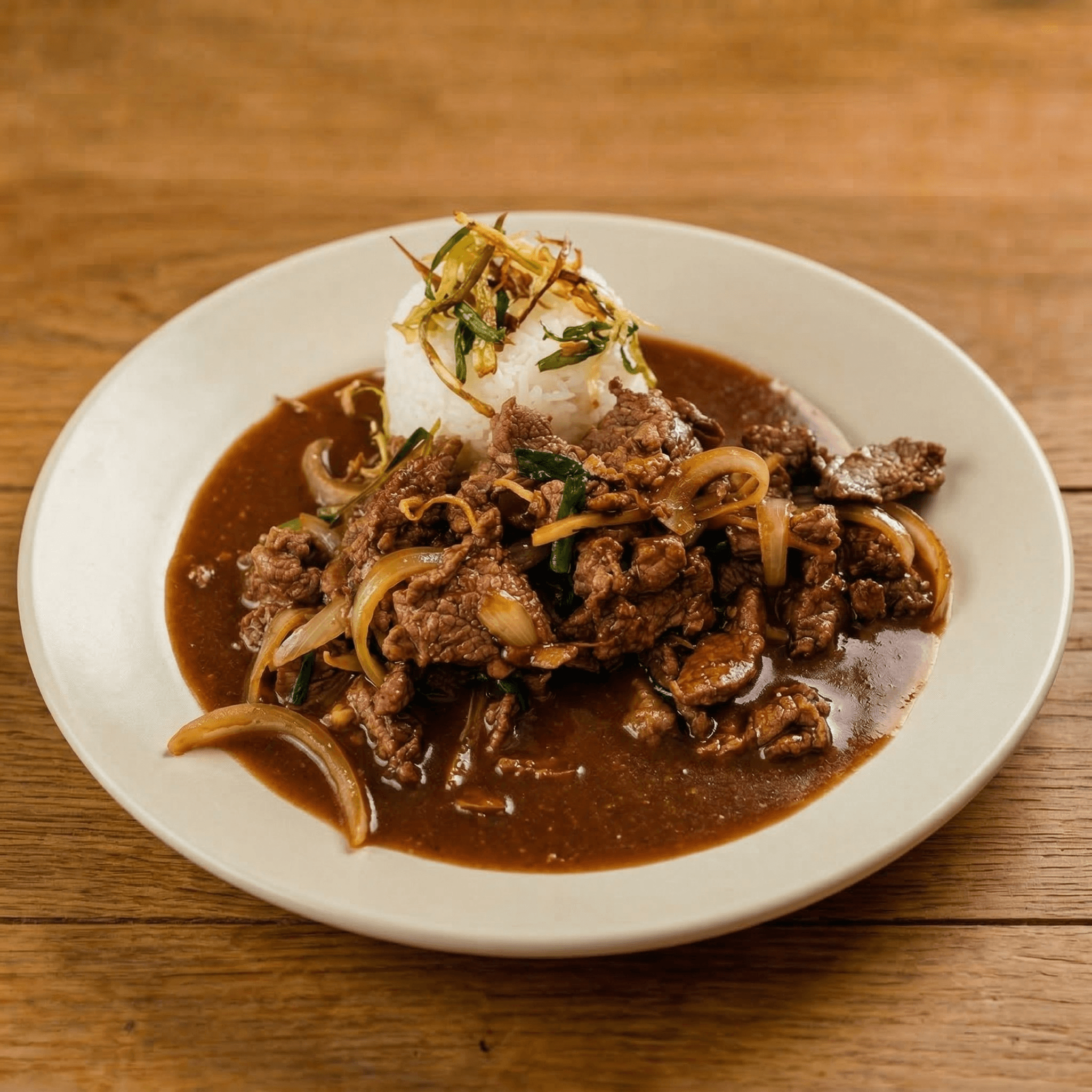 Thin slices of beef tenderloin served in a rice wine reduction of julienne ginger, garlic, scallions, & white onions