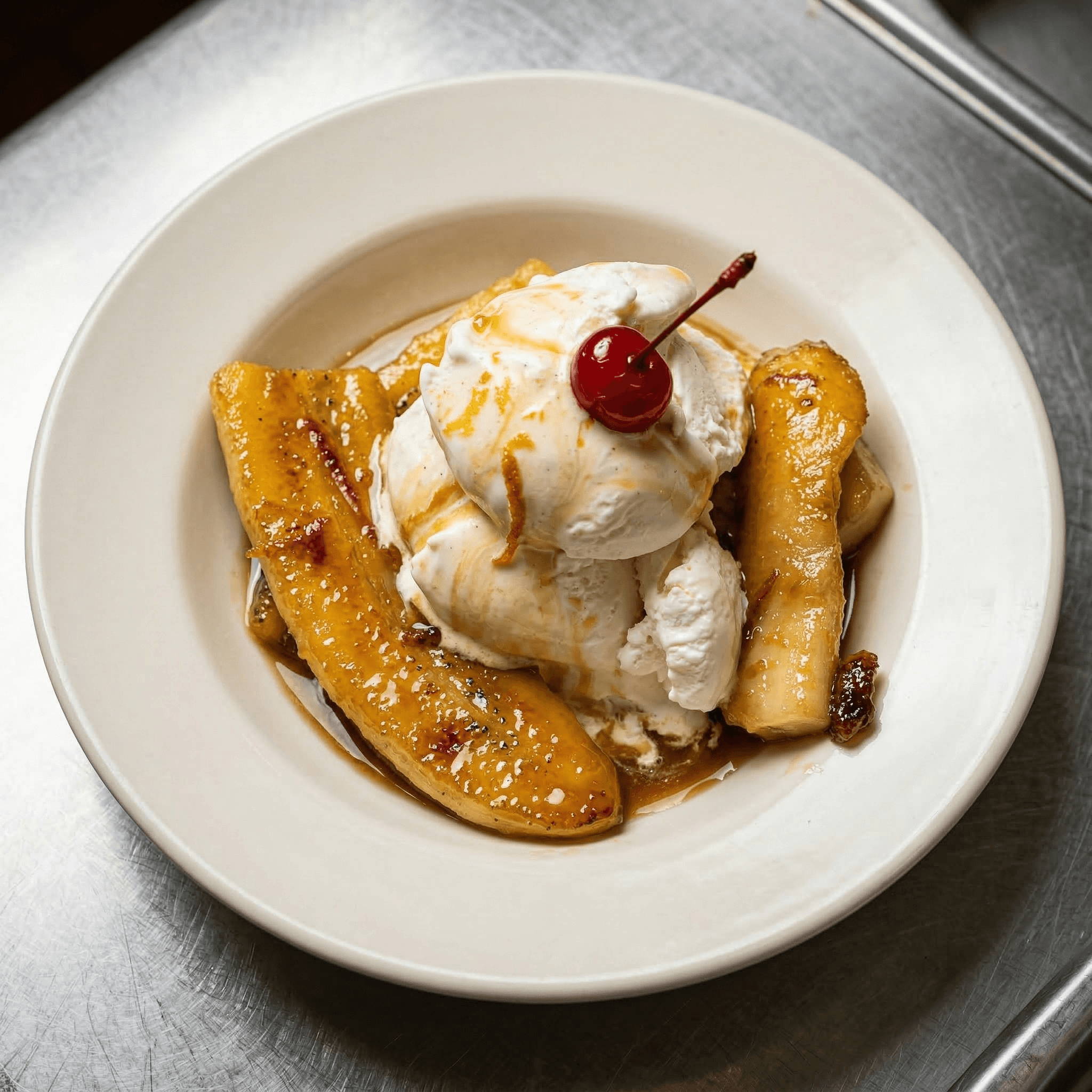 Slices of banana caramelized in brown sugar orange concentrated liquor sauce - served with vanilla bean ice cream