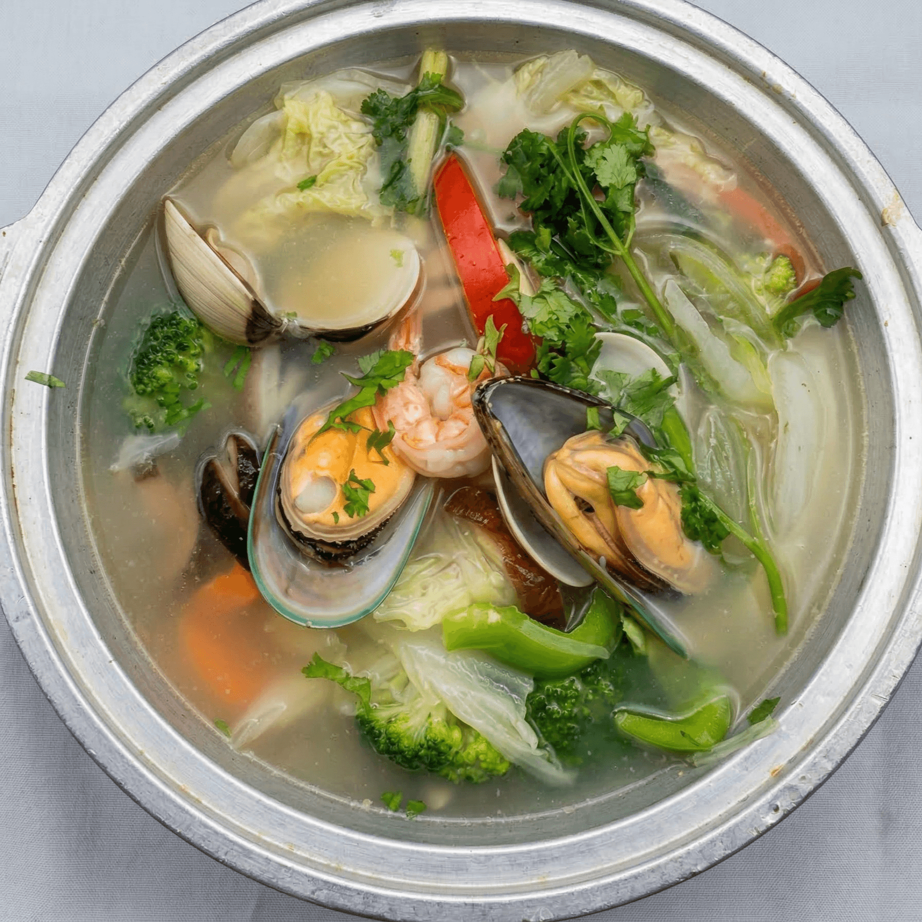 Napa cabbage, clear thick glass noodles, shrimp, calamari, crab claws, mussels, clams, salmon steamed in a light seafood broth. Please allow at least 20' to prepare the food