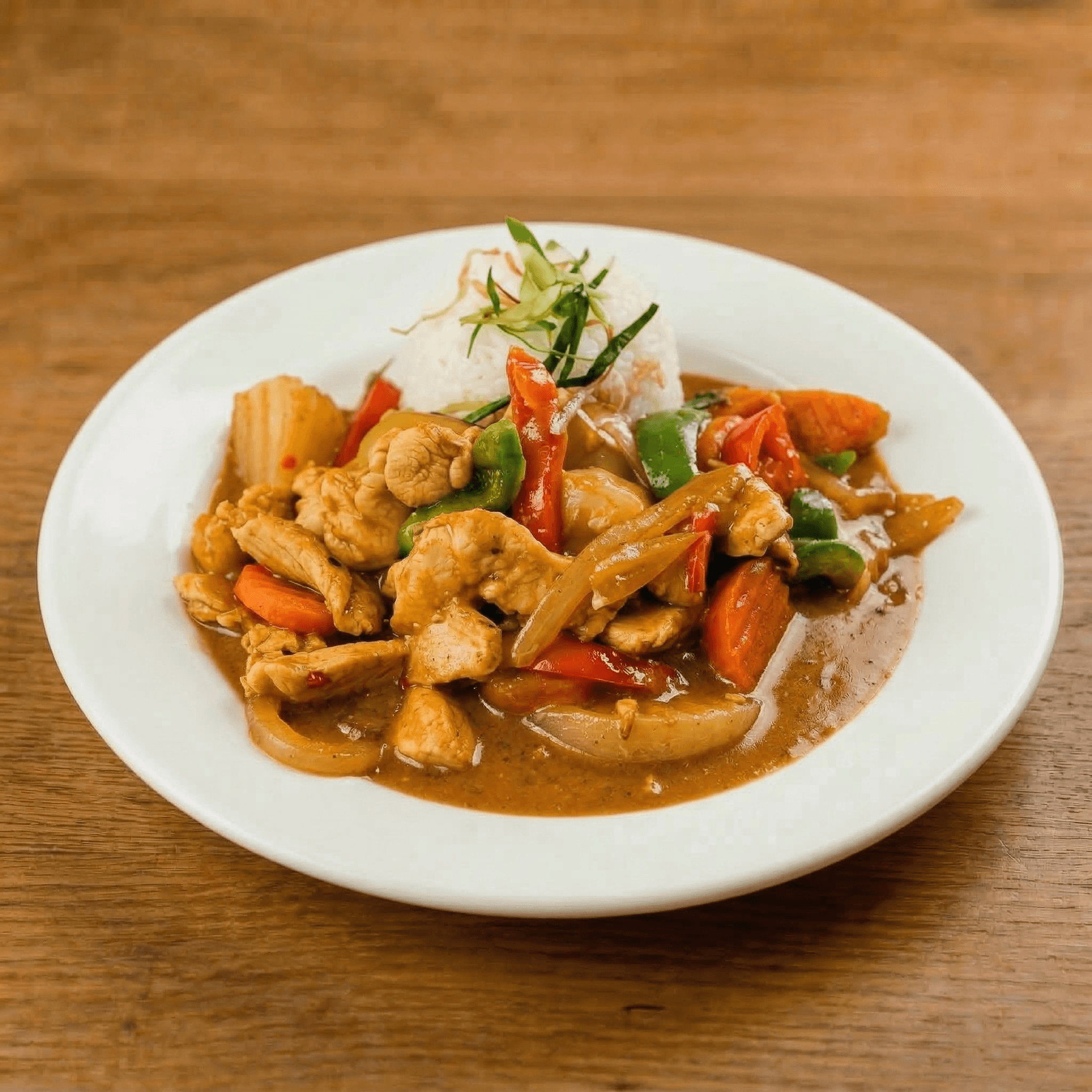 Sweet potatoes, carrots, onions, red & green bell peppers cooked in a mild, yellow coconut milk curry with a choice of chicken, tofu, shrimp or beef