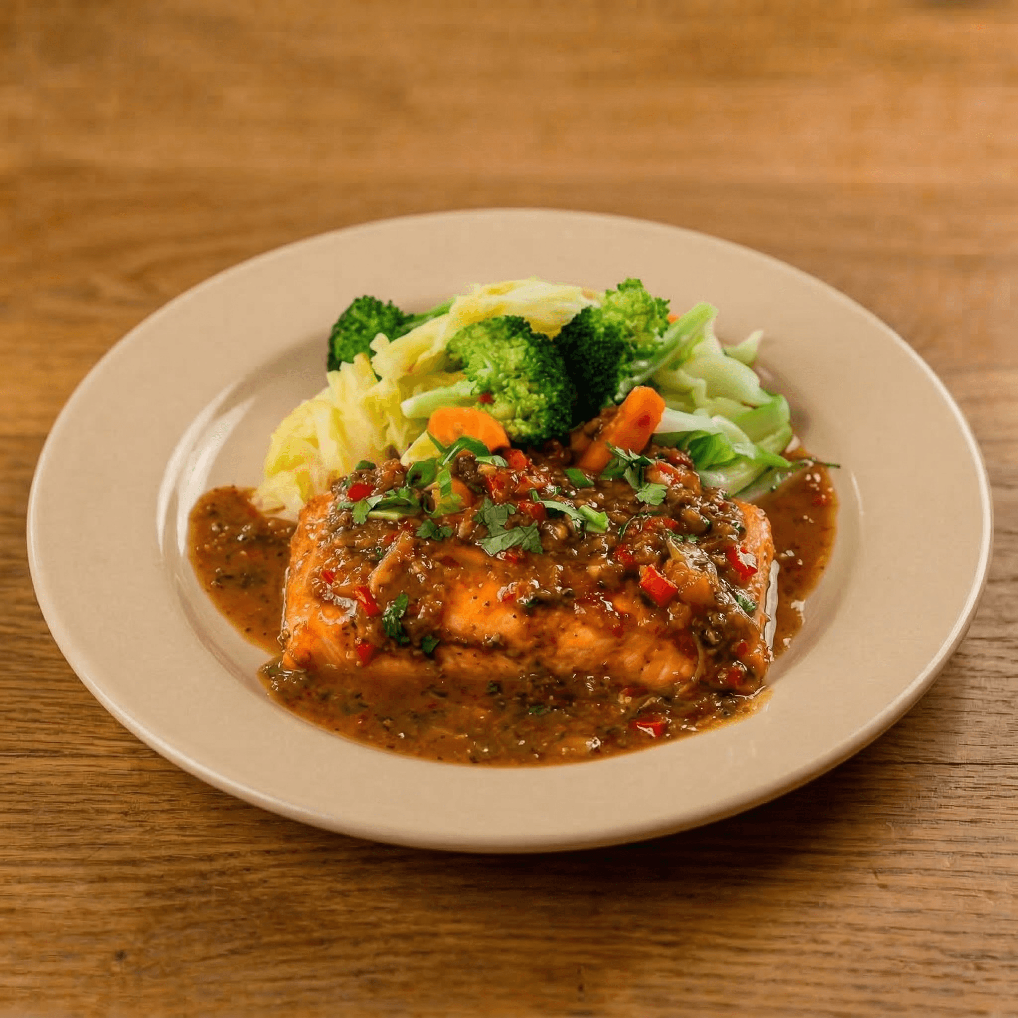 Grilled 10 oz filet of Atlantic salmon topped off with a spicy minced lemongrass, chopped red & green bell peppers in red chili sauce & steamed vegetables. Please allow at least 20' to prepare the food