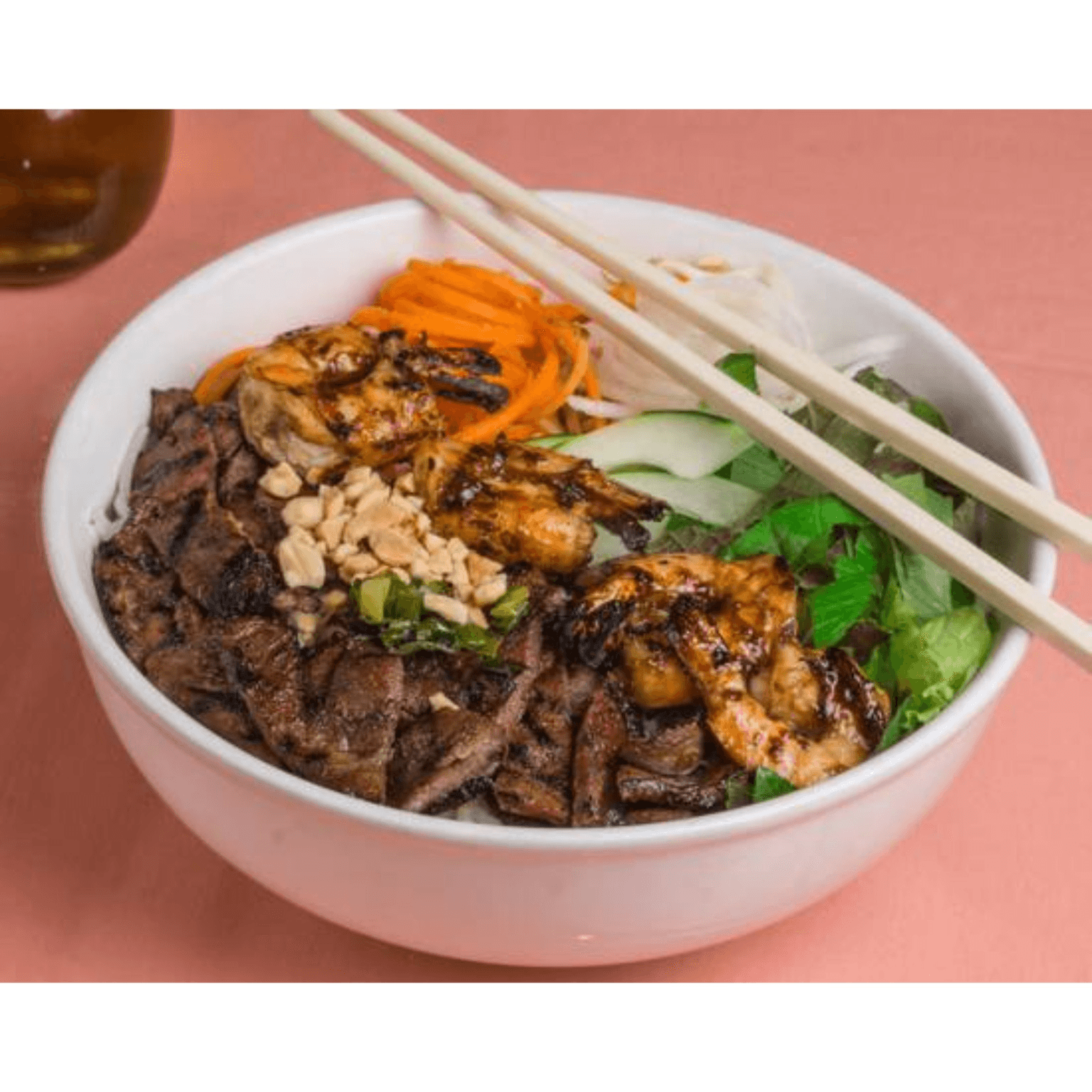 Large salad bowl of white rice noodles (steamed white rice upon request) bean sprouts, lettuce, mint, cucumbers, carrots, crushed peanuts & green onions topped with your choice of the following grilled items. Served with nuoc mam on the side