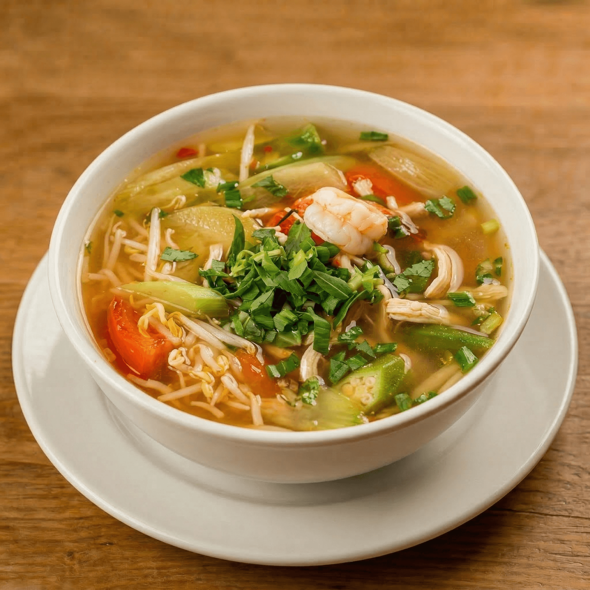 Generous amounts of chicken & shrimp in a light, tangy & spicy broth with fresh okra, bean sprouts, tomatoes, & silver taro stem, topped with blue tarragon