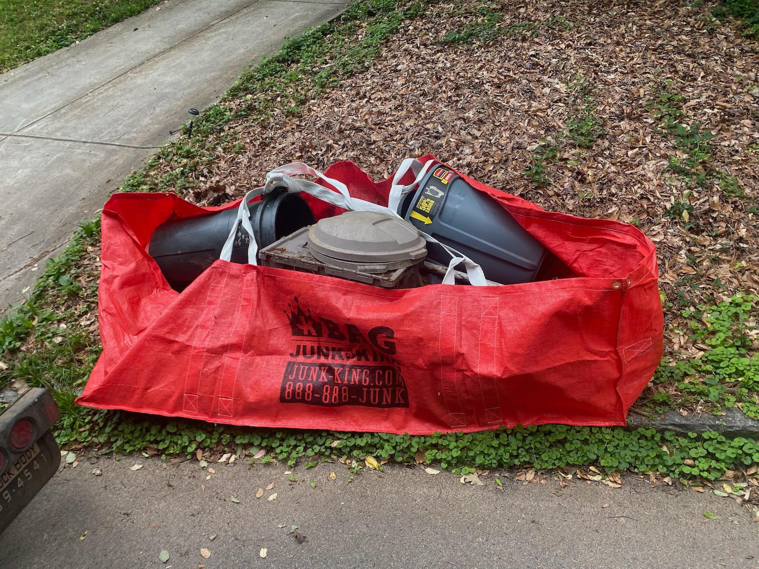 Take control of your junk disposal needs by using our Dumpster Bag! This is a perfect option to do things on your own terms. Our Dumpster Bag is a foldable bag with straps that can hold up to 3,000 pounds of junk! It easily unfolds, doesn’t take up much space, and holds its shape while you fill it up. There are no deadlines like using a dumpster. Order your JK Dumpster Bag online!