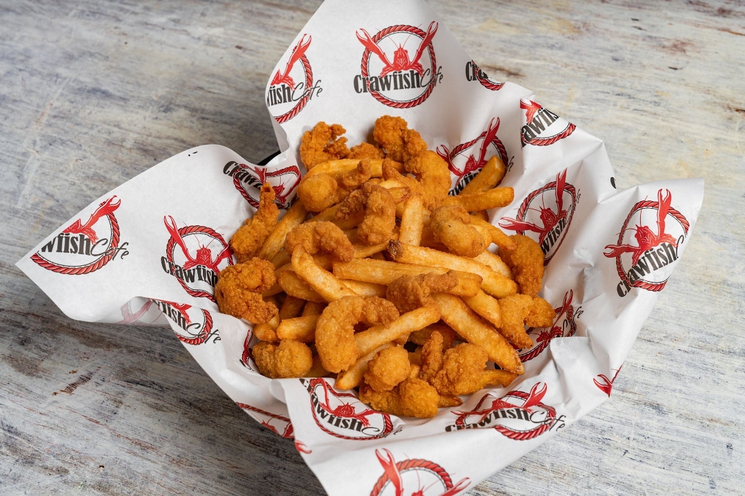 Popcorn shrimp served with french fries.