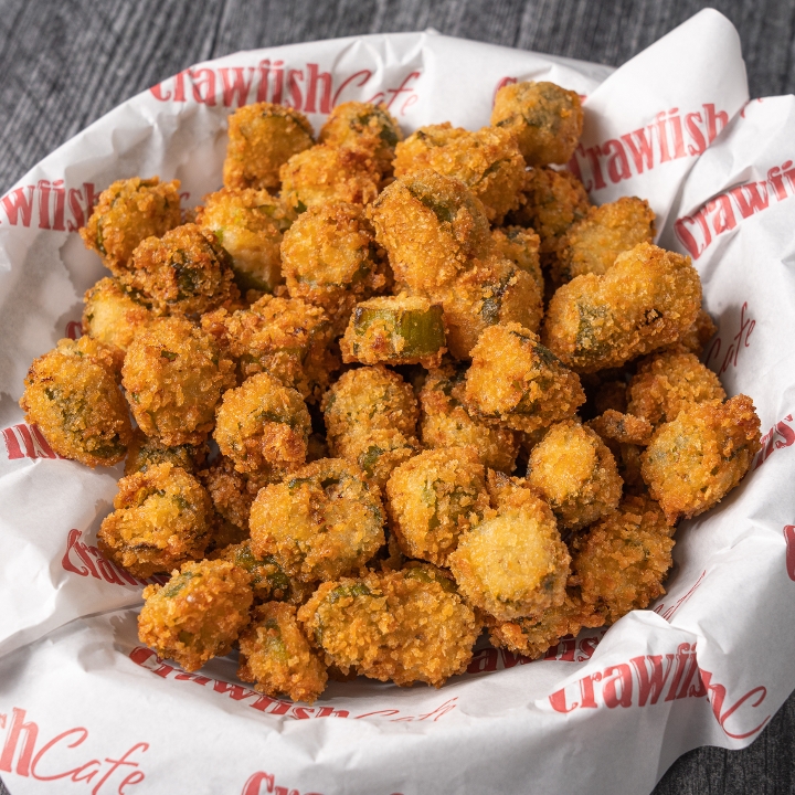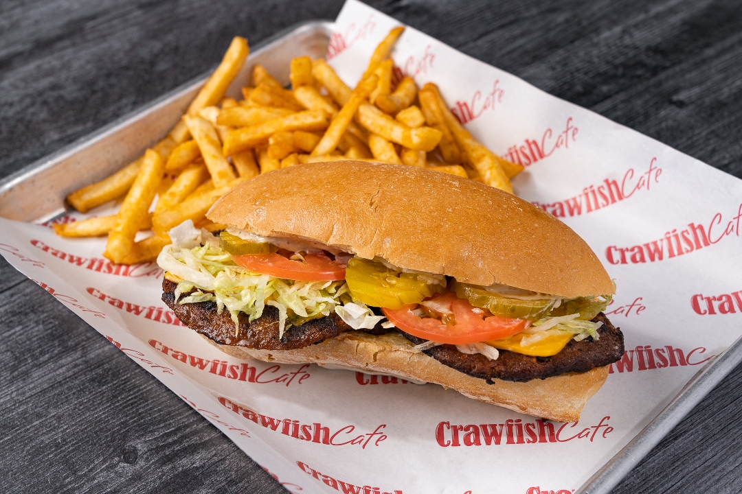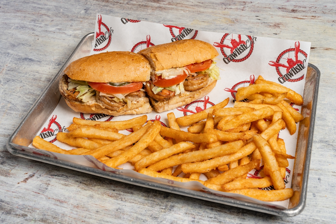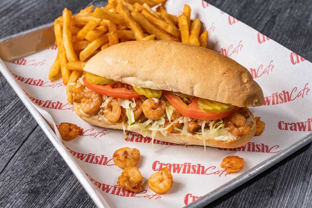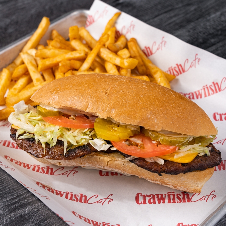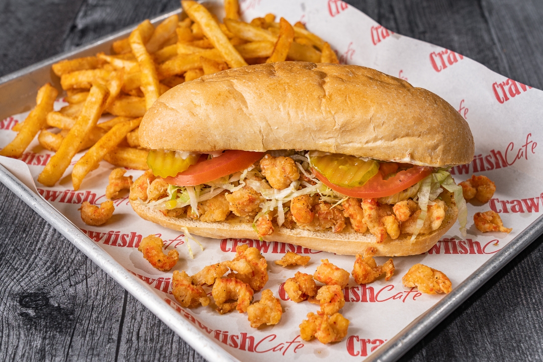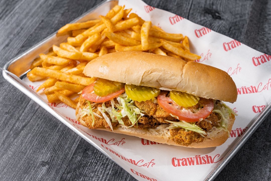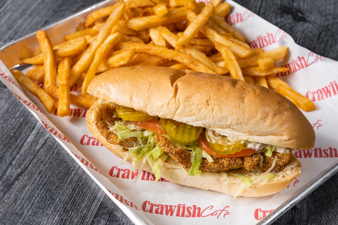 Fried crawfish tails, Creole remoulade, lettuce, tomatoes, and pickles on top of Leidenheimer poboy bread. Comes with choice of (1) side.
