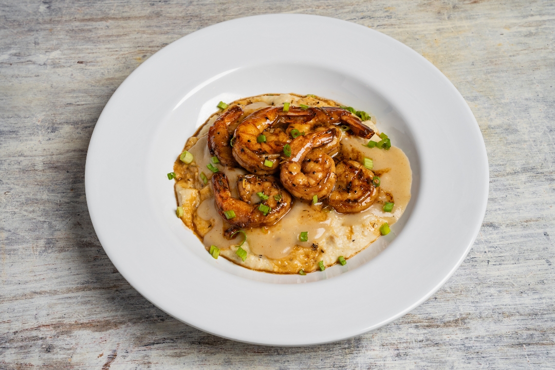 Cheesy grits, cajun butter shrimp with gravy.