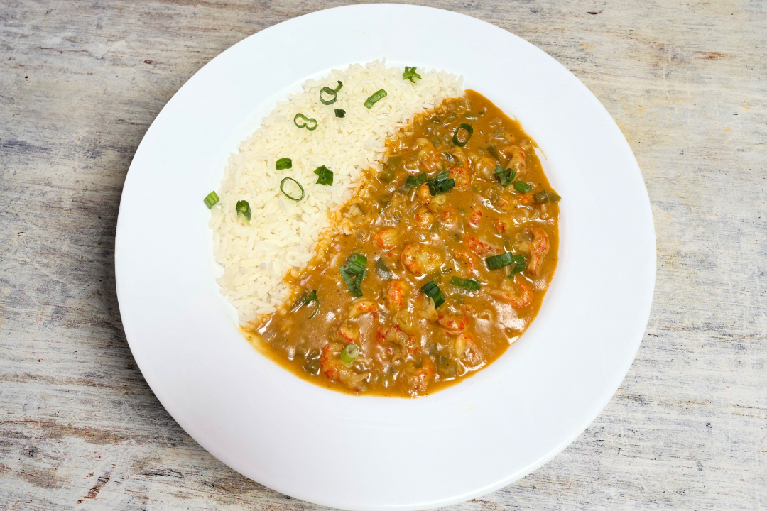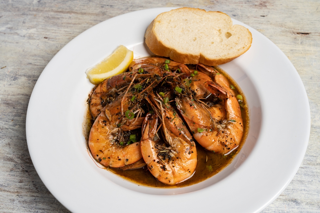 Grilled shrimp, Creole remoulade, lettuce, tomatoes, and pickles on top of Leidenheimer poboy bread. Comes with choice of (1) side.