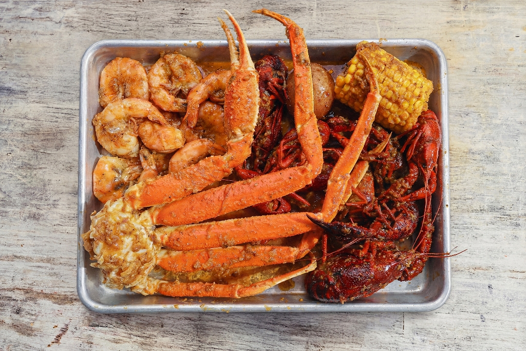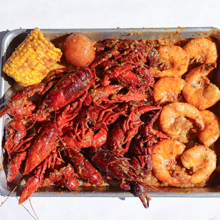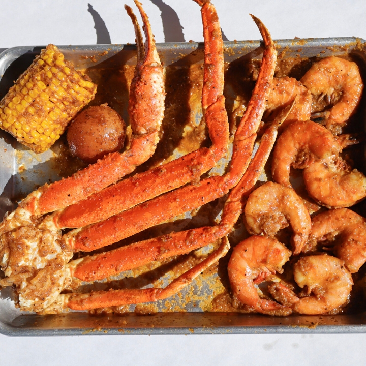 1 snow crab cluster, 1/2 lb shrimp, 1/2 lb live crawfish, 1 corn, 1 potato