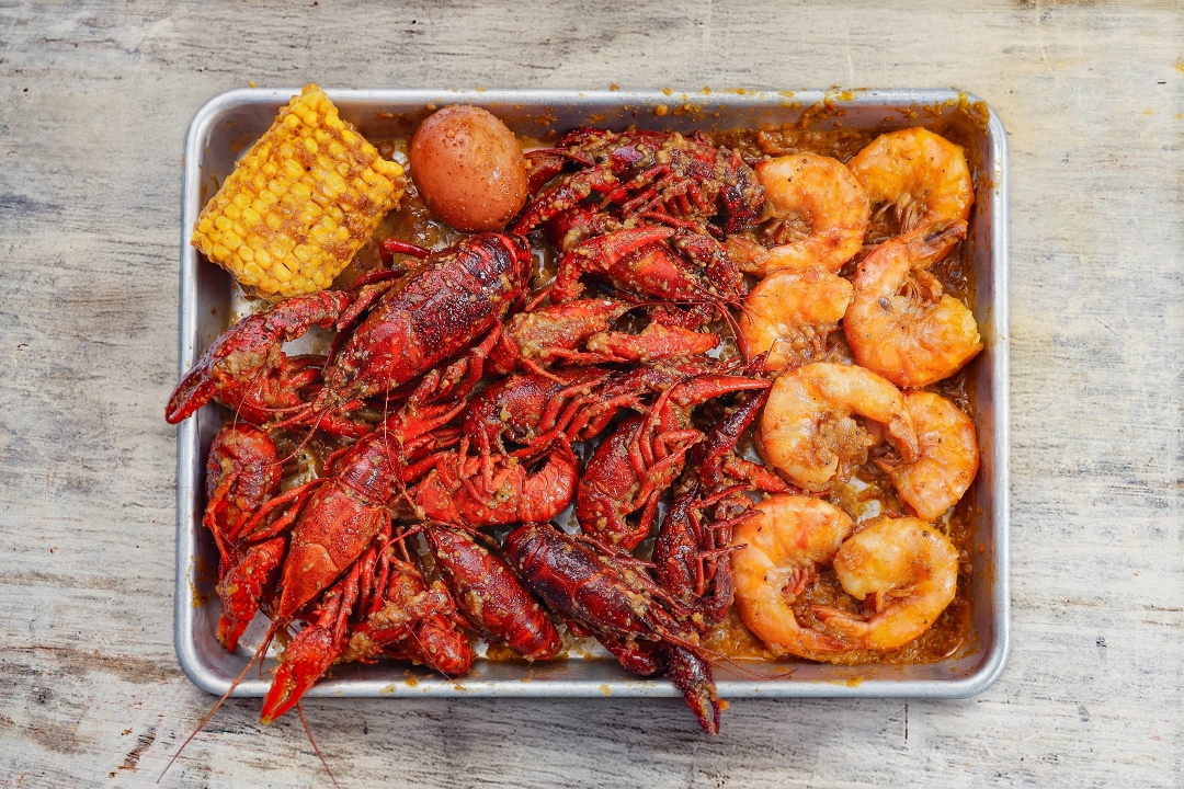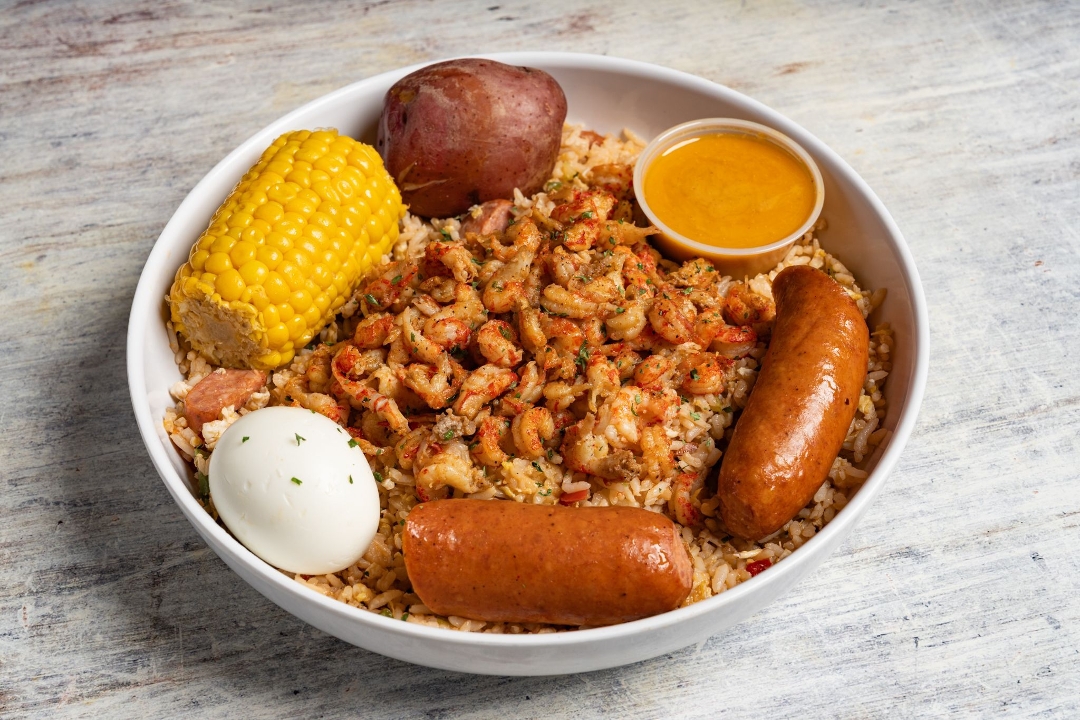 Fried rice, cajun butter crawfish tails, corn, potato, sausage, boiled egg, smack sauce