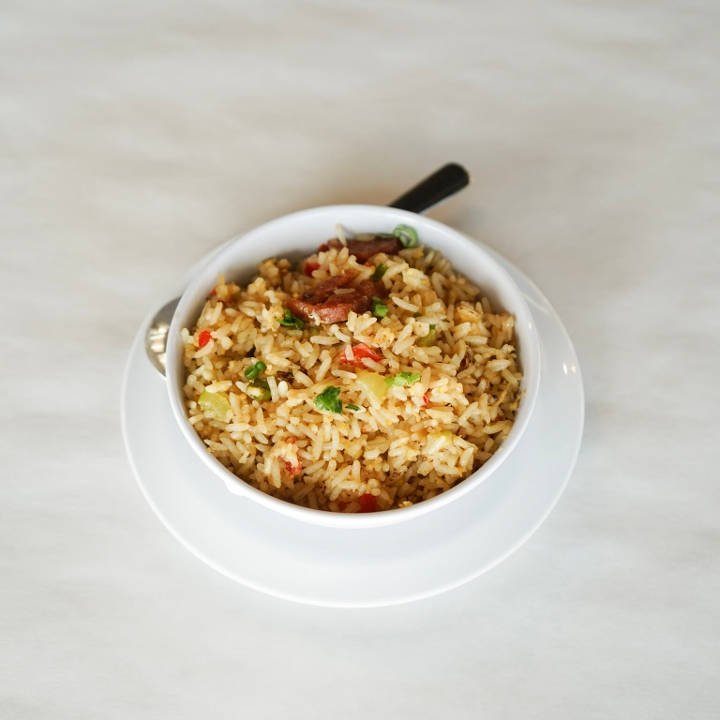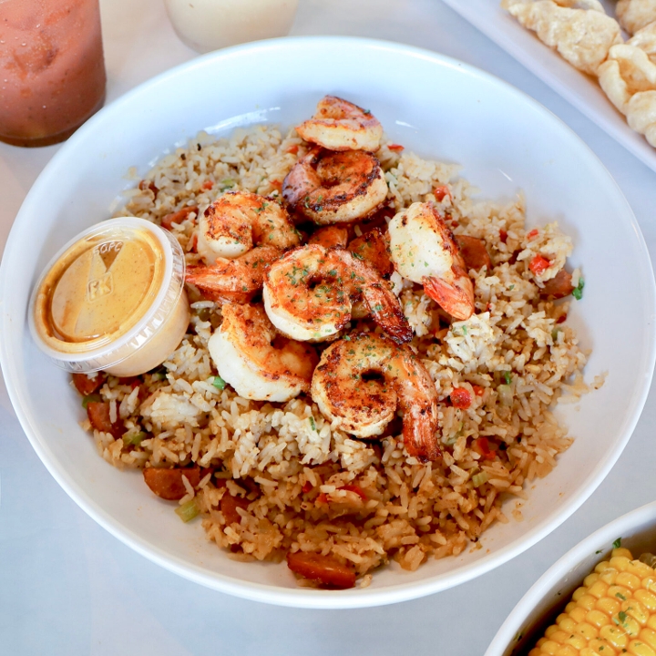 Fried rice, cajun butter shrimp, smack sauce