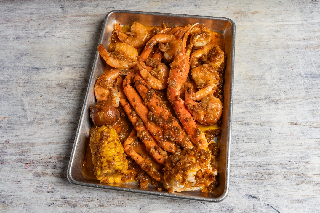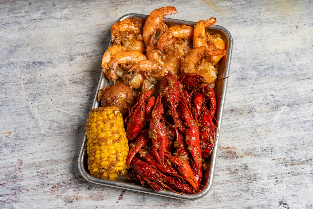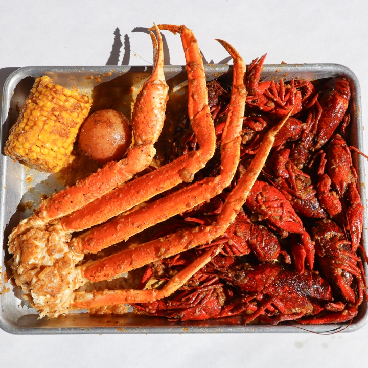 1 snow crab cluster, 1/2 lb shrimp, 1/2 lb frozen crawfish, 1 corn, 1 potato
