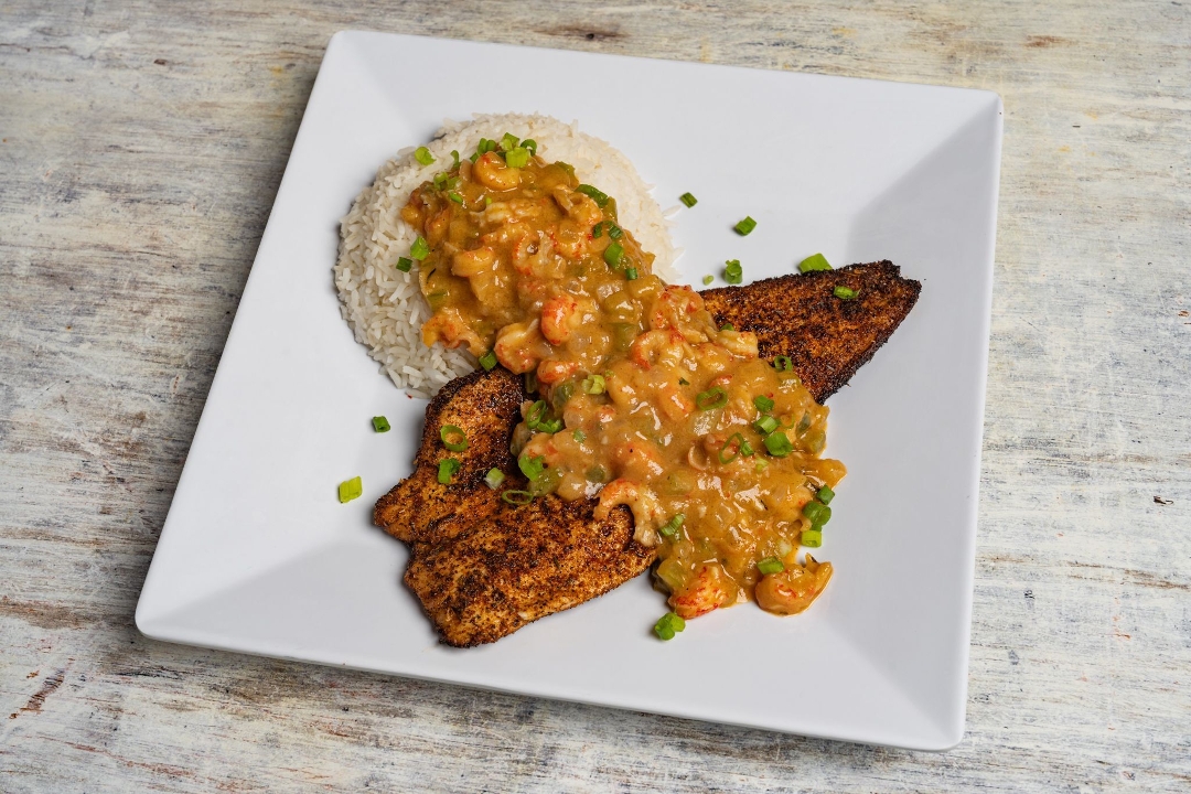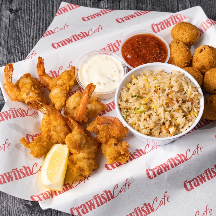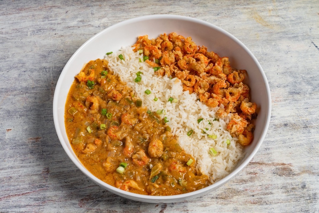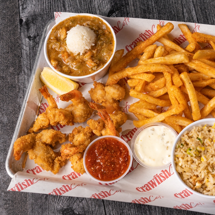 Half crawfish etouffee, half fried crawfish tails, served with white rice.