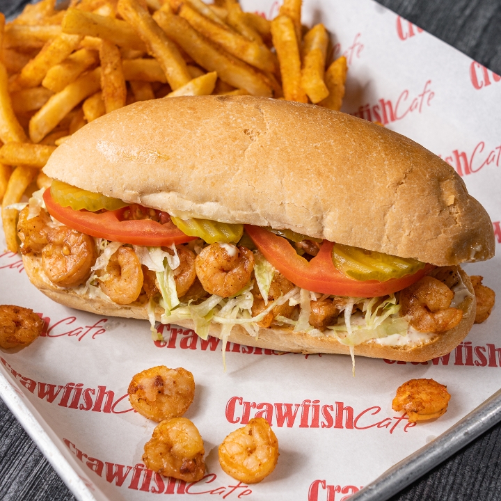 Fried shrimps, Creole remoulade, lettuce, tomatoes, and pickles on top of Leidenheimer poboy bread. Comes with choice of (1) side.