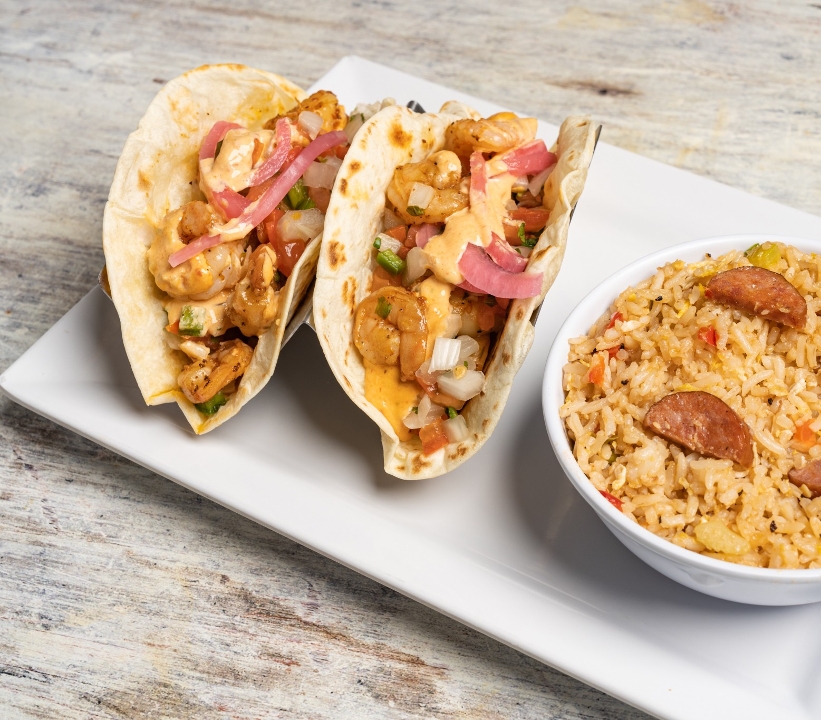 Blackened shrimp, pickled onions, coleslaw, and pico de gallo in a flour tortilla topped with chipotle tartar sauce. Served with a side of fried rice.