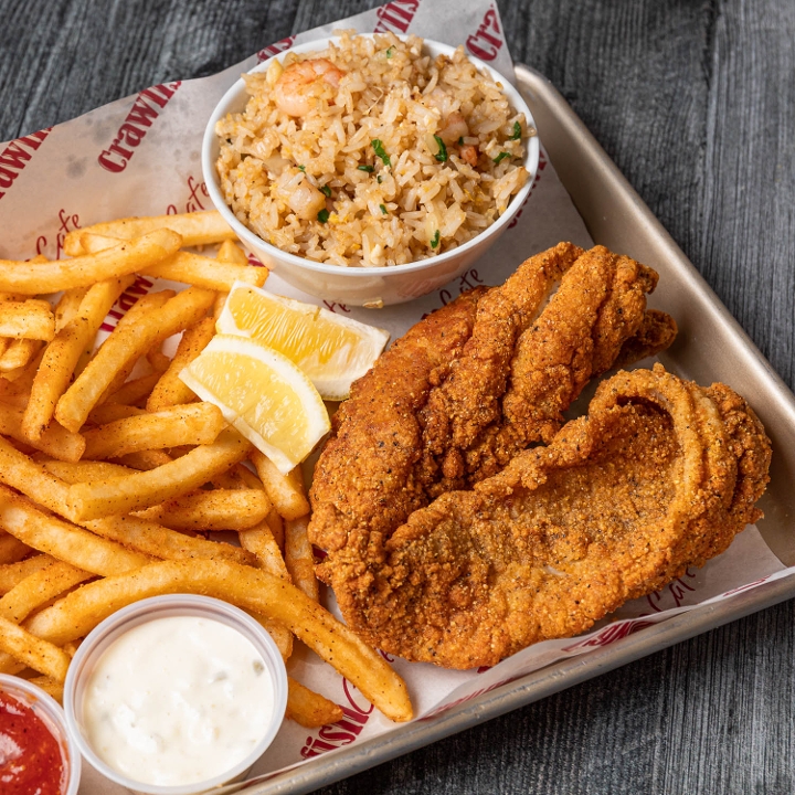Fried catfish, Creole remoulade, lettuce, tomatoes, and pickles on top of Leidenheimer poboy bread. Comes with choice of (1) side.