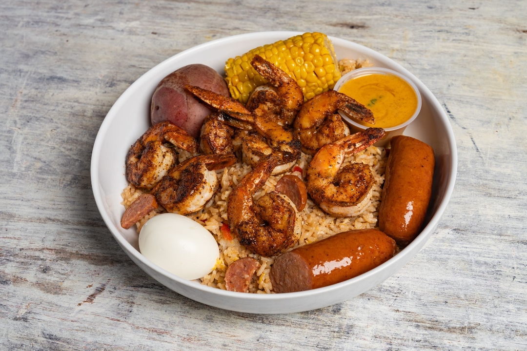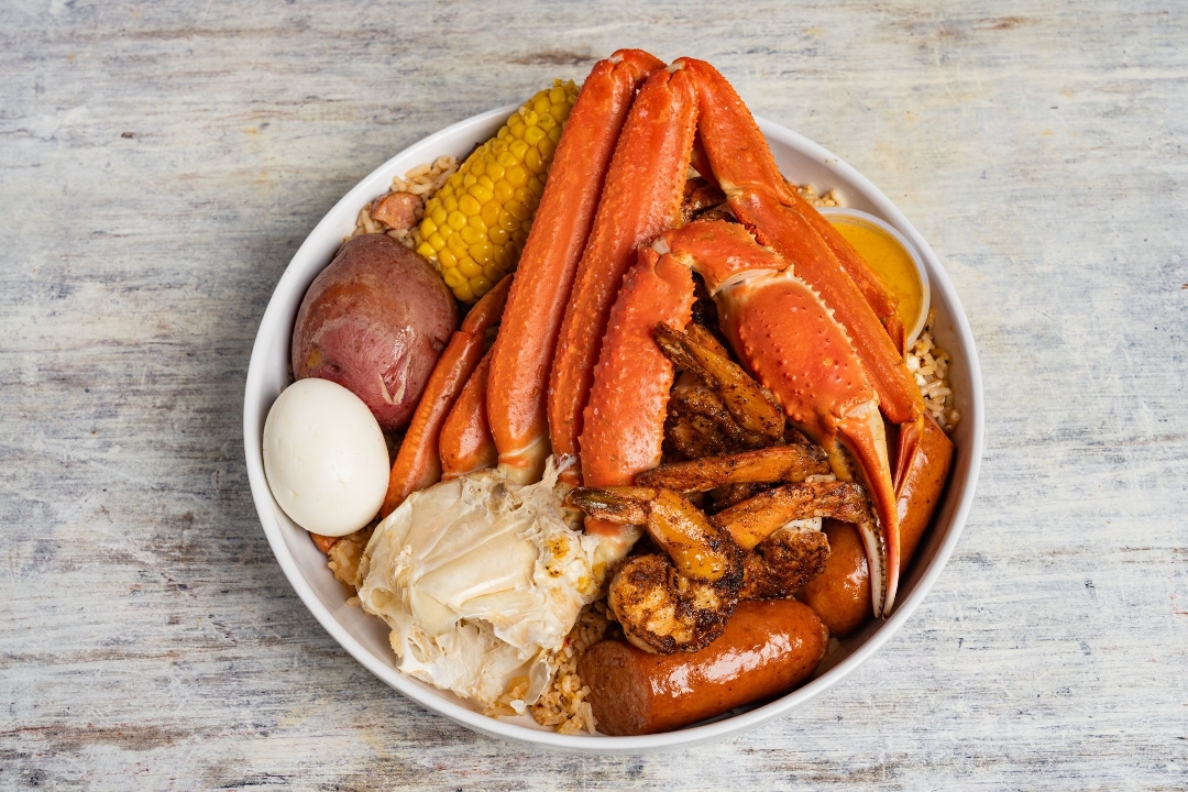 Fried rice, cajun butter shrimp, snow crab cluster, corn, potato, sausage, boiled egg, smack sauce