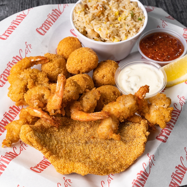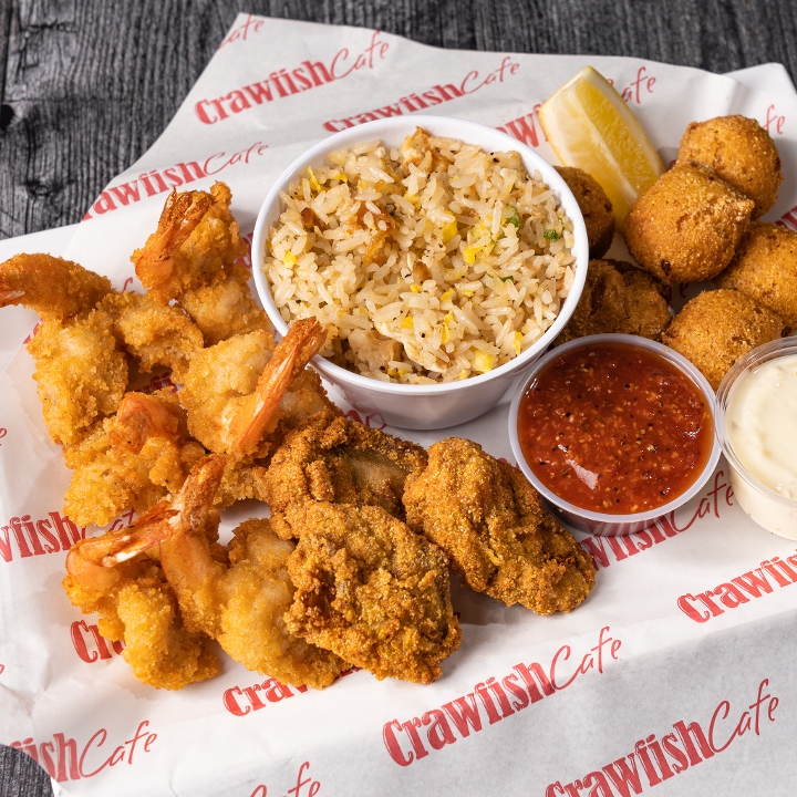 Half fried oysters and half fried shrimp, Creole remoulade, lettuce, tomatoes, and pickles on top of Leidenheimer poboy bread. Comes with choice of (1) side. No Substitutions.