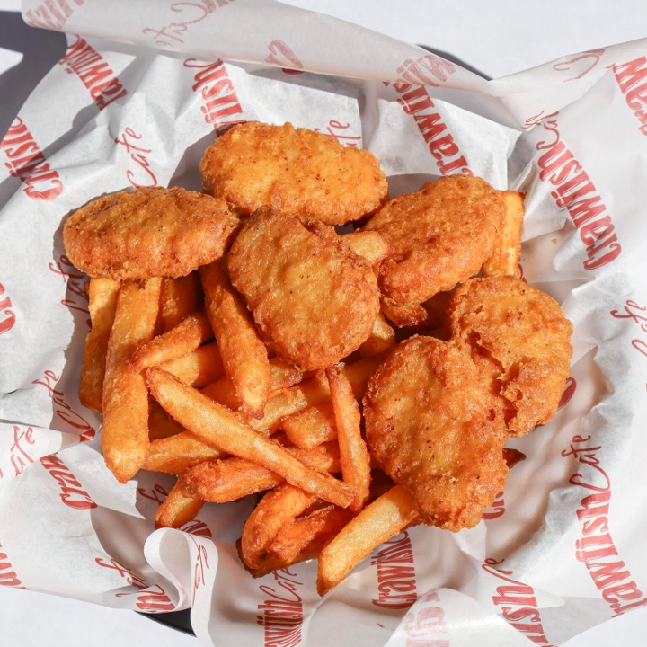 Chicken nuggets served with french fries.
